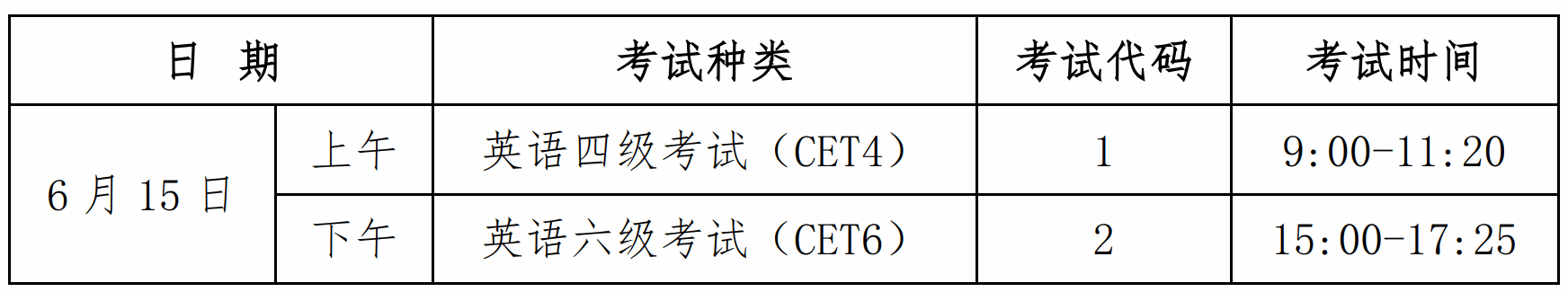 1.CET考试时间为6月15日,开考科目为英语四级和六级。